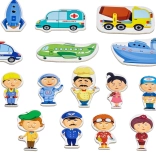 Du pompier au cuisinier – des personnages colorés, des uniformes et des véhicules apprennent aux enfants à distinguer les rôles professionnels, les environnements et les outils nécessaires.