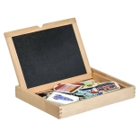 Le coffret comprend une éponge effaçable, un feutre noir pour écrire sur le tableau blanc et 5 craies de couleur pour dessiner sur la face noire. Les enfants entraînent ainsi les couleurs, la coordination œil–main et la représentation spatiale, et en suivant les modèles, ils développent leurs compétences sensorielles et leur créativité.