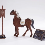 Construisez un imposant cheval de combat, qui se distingue par une armure argentée avec des boucles métalliques et des pattes avant articulées. Le modèle est fabriqué en bois de qualité et complété par des éléments en cuir, pour un rendu authentique et durable. Sont également inclus une drapeau totémique de combat et une barrière mobile, pour stimuler des histoires et scénettes créatives.
