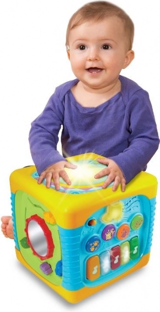 Chaque face propose un jeu différent : un petit piano avec notes et mélodies, un tambour changeant de couleur après un coup, un trieur de formes avec de grandes pièces, des roues dentées colorées, de petits animaux coulissants et un miroir pour découvrir son propre reflet. La cube est fabriquée à partir de matériaux de qualité, sûrs, et convient dès 8 mois.