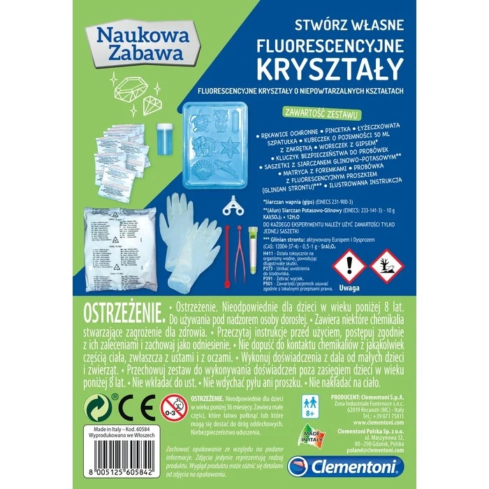 Découvrez la magie de la cristallisation avec ce kit créatif pour enfants et adultes. Créez vos propres cristaux fluorescents aux formes originales grâce aux moules et mélanges fournis. Le kit contient tout le nécessaire – alunite, sulfate de potassium, plâtre et moules – et est conçu et fabriqué en Italie.