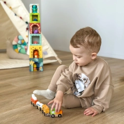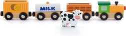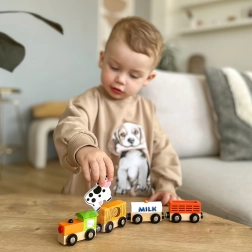 L’ensemble comprend une locomotive et trois wagons — une citerne marquée MILK, un wagon à bétail avec petite vache et un wagon de chargement. Les bords lisses et la conception durable conviennent parfaitement à la chambre d’enfant comme aux écoles maternelles.
