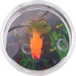Contenant compact et transparent avec un poisson réaliste et des éléments décoratifs pour le plaisir visuel.