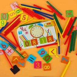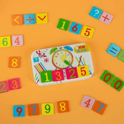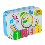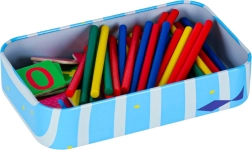 - 50 bâtonnets en bois colorés, 4× aiguilles d’horloge, 28 cartes magnétiques avec chiffres et signes mathématiques, étui métallique