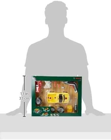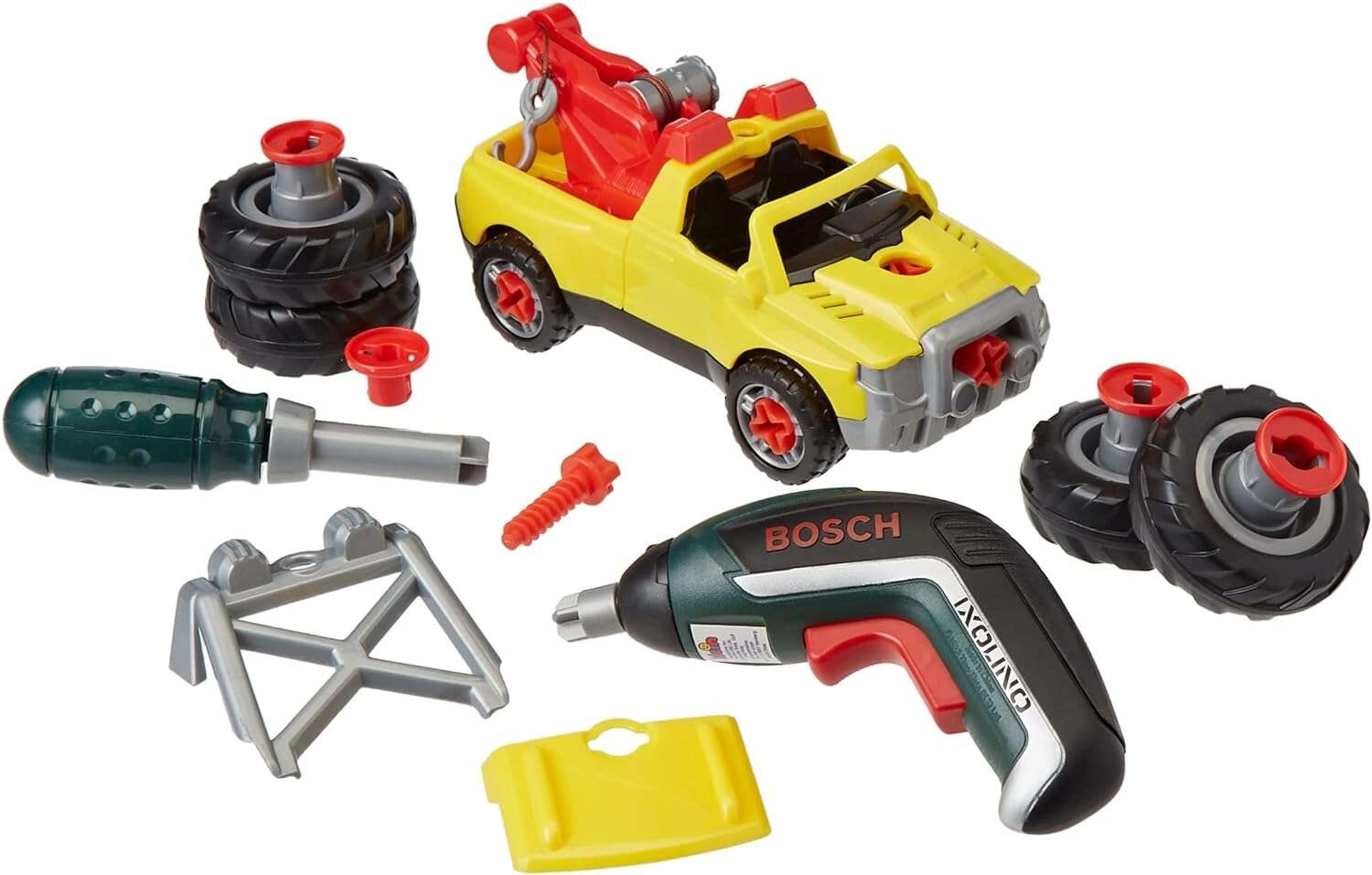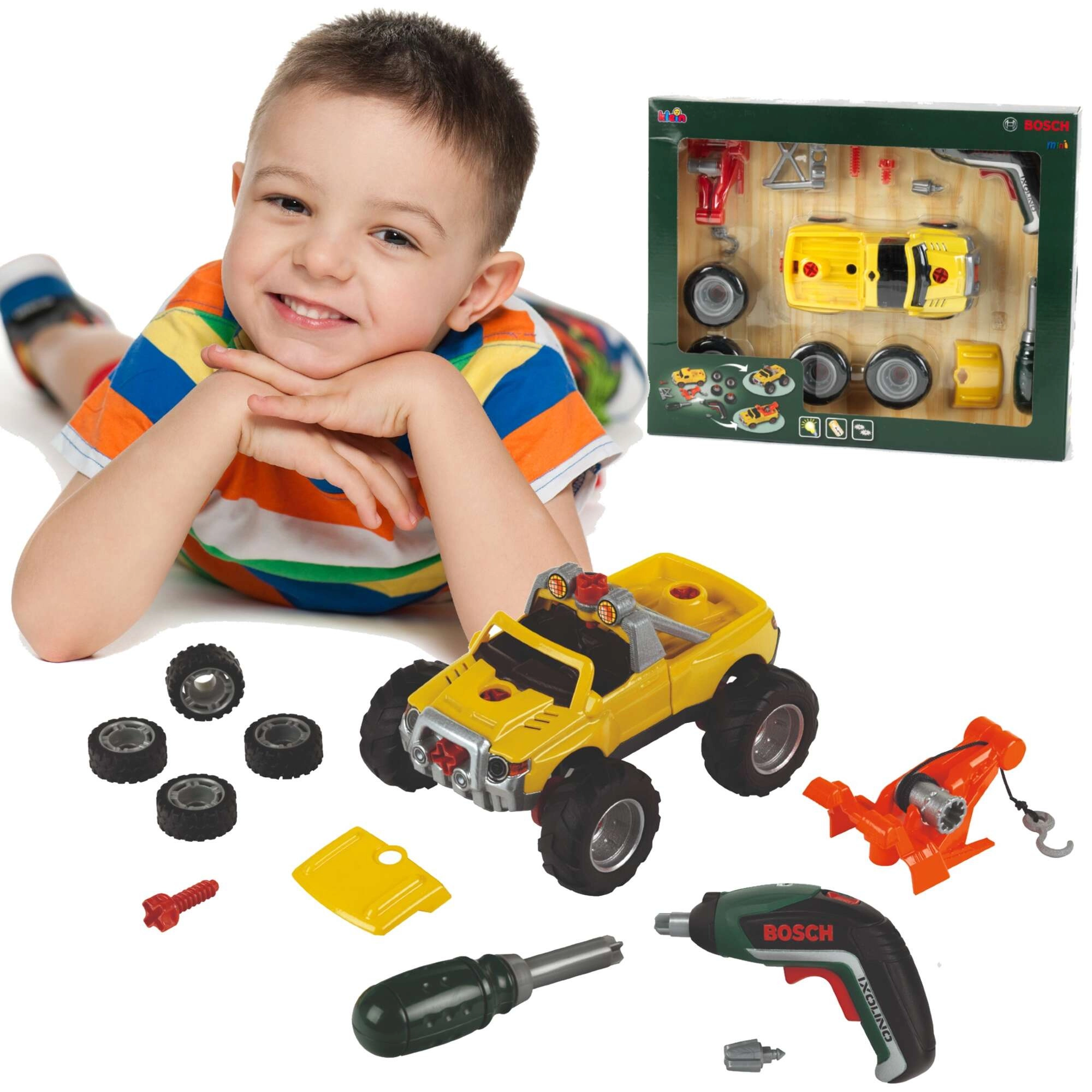 Le set comprend une voiture jaune à visser 3-en-1, une visseuse Bosch Ixolino II à rotation bidirectionnelle avec effet sonore, un tournevis manuel, des embouts interchangeables, des roues tout-terrain, un crochet de remorquage rouge, une calandre et un cadre avec phares. Les enfants peuvent transformer le véhicule en trois variantes pour un amusement durable.