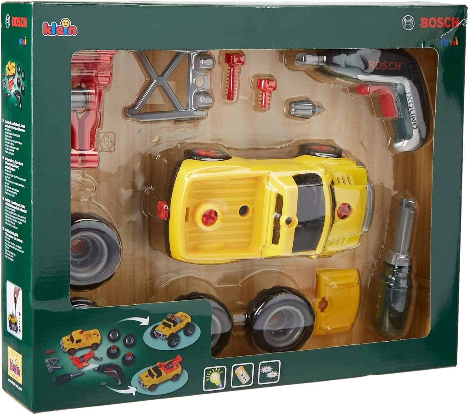Le kit de construction pour petits mécaniciens de la marque KLEIN, de la gamme sous licence BOSCH mini, propose une voiture à visser 3-en-1 et une visseuse sans fil pour enfants Bosch Ixolino II. Les enfants peuvent assembler un pick-up, un tout-terrain ou une dépanneuse, profiter de sons réalistes, de la rotation gauche/droite et d’un jeu sûr avec des outils.
