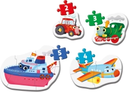 Premier ensemble de puzzles pour les tout-petits avec des motifs de moyens de transport, comprenant quatre puzzles de 2, 3, 4 et 5 pièces. Grandes pièces de 3 mm faciles à saisir, favorisant la motricité fine, la coordination œil-main et l’orientation spatiale. Idéal à partir de 2 ans.