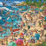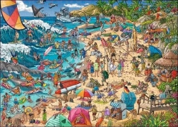 Le puzzle assemblé mesure environ 70 x 50 cm et est idéal pour des moments en famille ou pour une détente en solo. Immergez-vous dans l'ambiance vivante de la plage, où les gens profitent du surf, de la natation et de la détente par une journée ensoleillée.