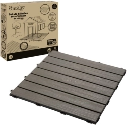 Le lot de 6 pièces de 45 × 45 cm est conçu pour être compatible avec toutes les maisonnettes SMOBY. L’installation se fait sans outils – il suffit de clipser les panneaux entre eux et de les poser sur une surface plane.