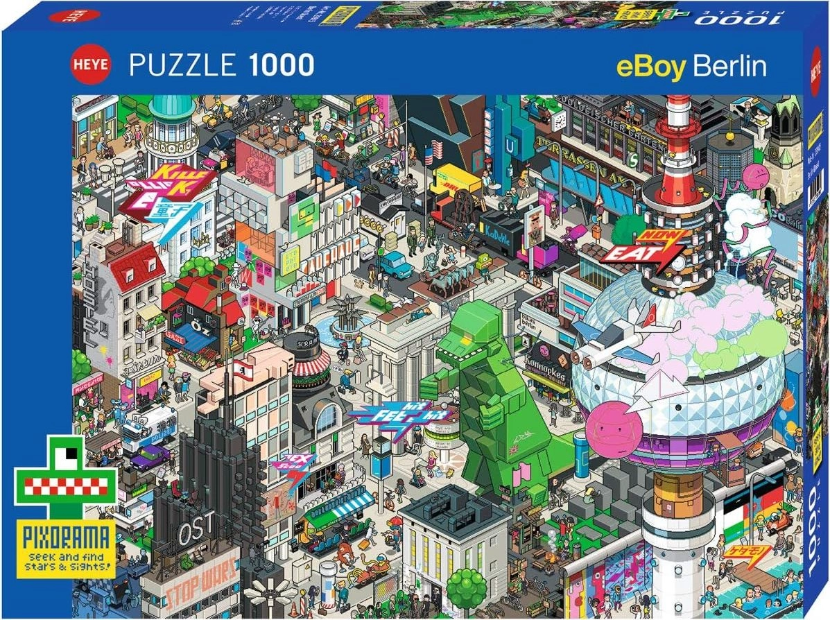 Découvrez le puzzle Pixorama unique sur le thème de Berlin par le célèbre collectif de pixel art Eboy. Vous attendent 1000 pièces riches en détails, formant une scène colorée, ludique et d’une grande précision. Idéal pour les amateurs de villes, de design et de défis de montage plus exigeants.