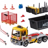 1 figurine d’ouvrier du bâtiment, camion avec module d’extension interchangeable, benne basculante, remorque, boîte à outils avec couvercle, jerrican et autres accessoires
