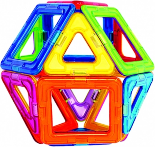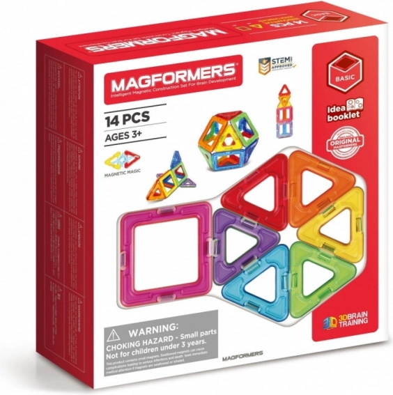 MAGFORMERS BASIC 14 sont des blocs avec de puissants aimants en néodyme intégrés qui s’attirent toujours entre eux. Il suffit d’approcher les faces de deux blocs pour qu’ils se connectent immédiatement. À partir de pièces façonnées selon des formes géométriques, vous pouvez construire de superbes structures tridimensionnelles. Pendant le jeu, vous pouvez utiliser le guide fourni, d’autres exemples sur le site magformersworld.com ou votre propre imagination. Le set comprend : 8 triangles ; 6 carrés.