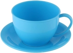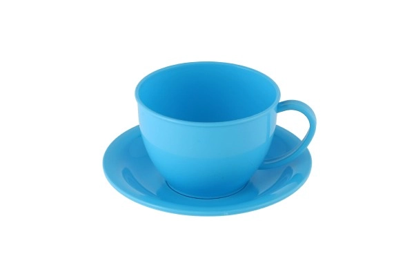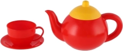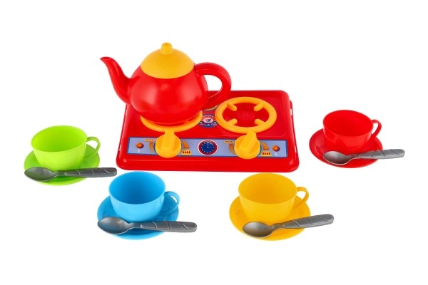 Une bouilloire rouge et quatre tasses colorées avec soucoupes permettent de préparer et de « servir » le thé à toute la famille ou aux amis.