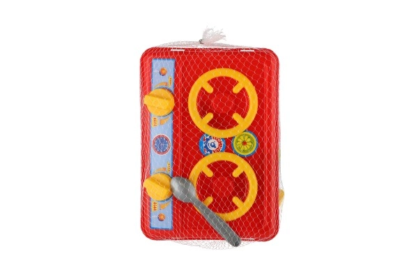 Cuisinière rouge à deux plaques avec boutons rotatifs qui stimule l’imagination et initie les enfants aux bases de la cuisine en toute sécurité.