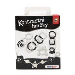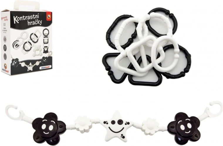 Ce set contrasté en noir et blanc est conçu pour les tout-petits qui ne distinguent pas encore les couleurs. Les motifs à fort contraste attirent naturellement le regard et favorisent la stimulation visuelle ainsi que la concentration. Grâce à des formes étudiées, les jouets sont faciles à saisir par les petites mains et aident à entraîner le réflexe de préhension et la coordination œil-main.