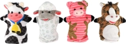Le set comprend quatre marionnettes de la ferme : une vache, un mouton, un petit cochon et un cheval, idéales pour créer des histoires féeriques.
