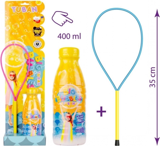 Avec cet anneau léger et le liquide original TUBAN, vous créerez facilement de gigantesques bulles de savon. L’anneau est suffisamment petit pour les enfants, mais assez grand pour des effets de bulles impressionnants. Le liquide est fabriqué dans l’UE et répond à la norme EN 71 – sécurité des jouets.