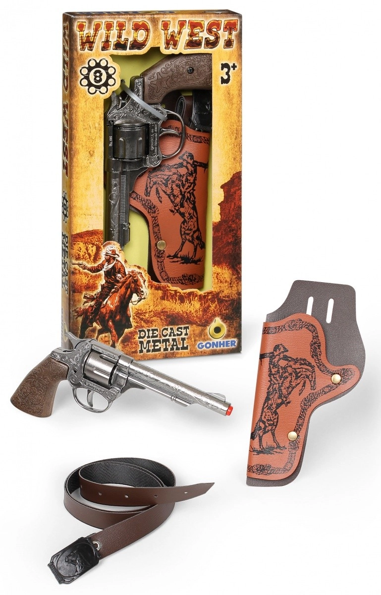 Plongez dans l’atmosphère du Far West avec ce revolver en métal de qualité signé GONHER. Sa finition réaliste, son poids agréable et son mécanisme fiable à 8 cartouches en font un excellent accessoire pour les jeux d’Indiens et de cow-boys ainsi qu’une pièce stylée pour les collections.