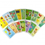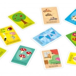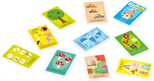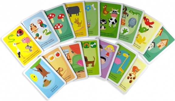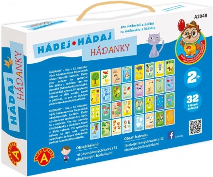16 grandes cartes colorées (32 devinettes illustrées), notice en tchèque et en slovaque, boîte rigide avec poignée