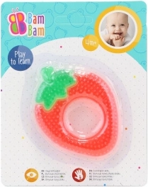 Anneau de dentition coloré et ludique avec gel rafraîchissant à l’intérieur – fraise. Emballé sur carte en papier. Dimensions de l’emballage 17 × 13,5 cm. Taille de l’anneau de dentition 10 cm. Âge 4 mois et plus.