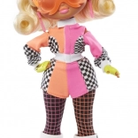La poupée est vêtue d’une tenue colorée et stylée avec des motifs à carreaux, mettant en valeur son originalité et sa valeur de collection.