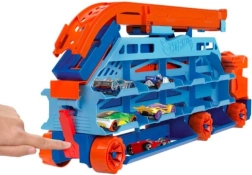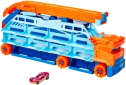 Vivez deux fois plus d’action avec un transporteur qui se transforme en piste gravitationnelle ! Le grand véhicule à six roues massives transporte et range votre collection en toute sécurité, et en un seul geste, vous le transformez en descente de 60 cm pour des courses pleines d’adrénaline.