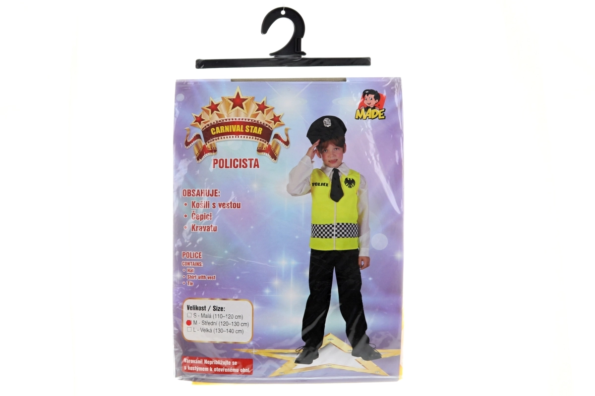 Le set comprend une chemise avec cravate, une veste de police et une casquette, pour créer facilement un look complet. Les accessoires restants, comme un pantalon sombre ou des chaussures, peuvent être ajoutés selon vos possibilités.