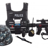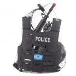 Le casque, les lunettes, le talkie-walkie, la grenade et la montre composent un set de police complet. Grâce à l’emballage en filet, tout reste bien organisé au même endroit.