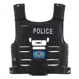 Équipement de police réaliste pour les déguisements d’enfants et les aventures quotidiennes. Le gilet noir avec inscription POLICE offre un look authentique et des poches pratiques, la mitraillette à effet cliquet renforce l’expérience d’action et le casque à motif camouflage complète la tenue.
