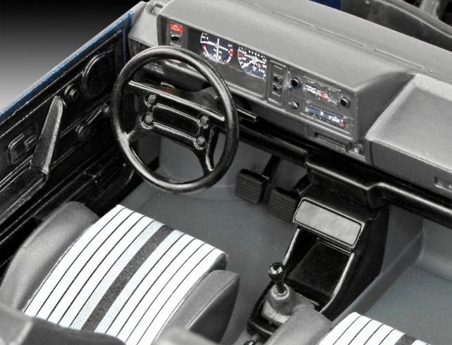Le coffret comprend une maquette de la voiture compacte allemande VW Golf de première génération, 6 peintures de base, un pinceau et de la colle.