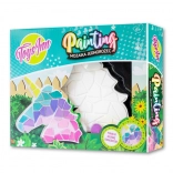 Le coffret avec une figurine plate de tête de licorne comprend : 5 couleurs, un pinceau, 2 plateaux pour papier.