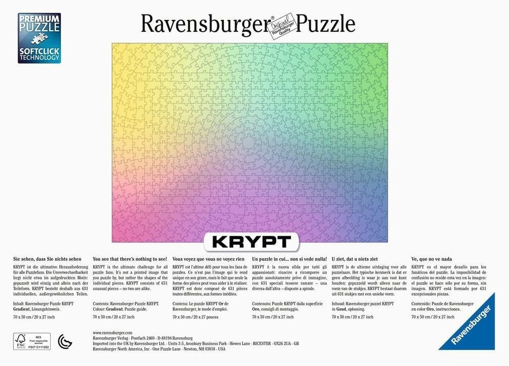 Le puzzle Ravensburger Krypt Gradient est une composition unique sans motif classique : au lieu d’une image, vous êtes guidé par une composition en spirale et un dégradé de couleurs fluide. Les formes inhabituelles des pièces offrent un défi intelligent, en solo ou en groupe, idéal pour se détendre tout en entraînant sa concentration.