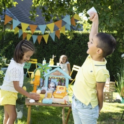 Le riche ensemble de 38 accessoires comprend une machine à glace, des cornets et des boules, une cuillère à glace, une brochette de fruits, des vermicelles, de la vaisselle, des couverts et une caisse. Grâce à ses dimensions compactes, le stand est parfait pour le jardin, le parc ou la plage – idéal pour les petits hôtes et hôtesses des fêtes d’été.