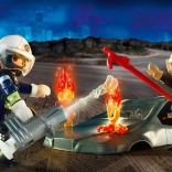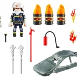 Comprend tout l'équipement de base pour un exercice de pompiers, y compris des figurines de pompiers, une voiture en feu et les accessoires nécessaires.
