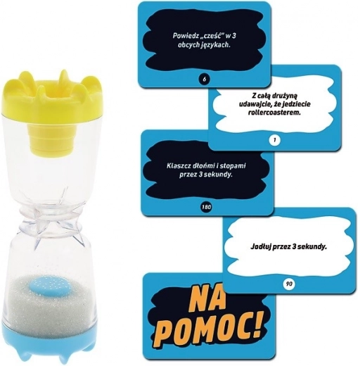 222 cartes recto verso avec défis, 2 cartes « À l’aide ! », sablier, règles du jeu