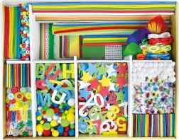 - env. 1300 pièces (film transparent, papier translucide, carton ondulé coloré, feutrine, polaire, strass autocollants, éléments en mousse, pinces à linge, bâtonnets en bois, plumes, ruban crépon, boutons, etc.)