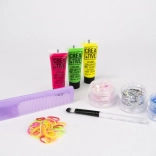 - 3 gels colorants pour cheveux, 3 paillettes en poudre, élastiques, pinceau, peigne