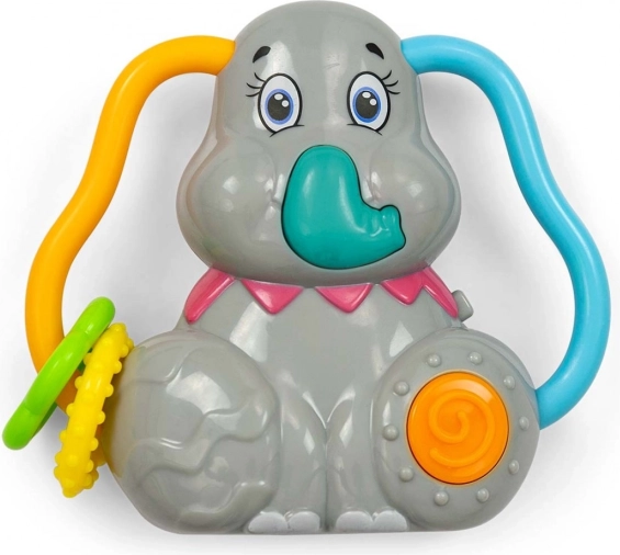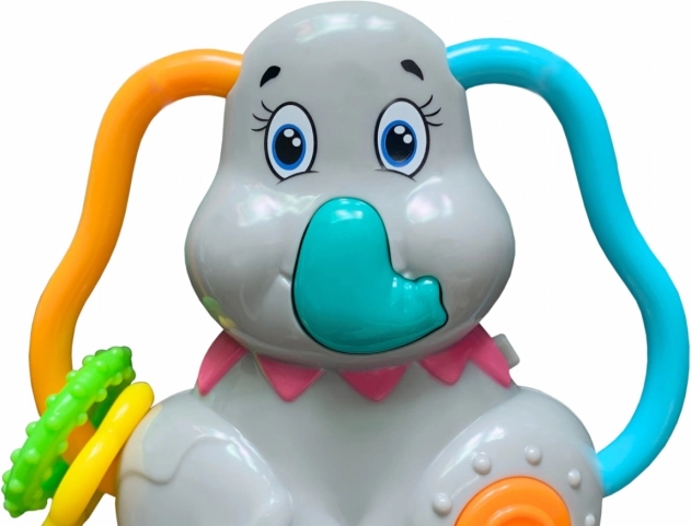 Design interactif : Le hochet en forme d’éléphant est équipé de grandes oreilles en relief pour une prise en main facile et le déplacement des anneaux colorés. En appuyant sur la trompe, on entend le cri de l’éléphant, et les six mélodies se sélectionnent via une molette orange.