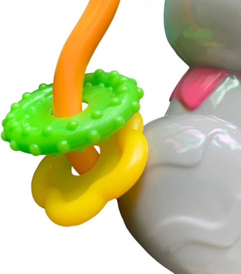 Le hochet dispose de grandes oreilles faciles à saisir et permet de faire coulisser des anneaux colorés avec reliefs.
