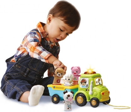 Découvrez le tracteur ludique et éducatif Joyeux de VTech, qui apprend aux enfants les formes, couleurs, animaux et chiffres. Les animaux à insérer et « qui sautent » se balancent joyeusement pendant la conduite et stimulent la motricité fine ainsi que la pensée logique.