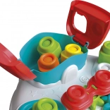 La table propose un large éventail d'activités pour développer les compétences motrices des enfants, telles que des engrenages, un catapulte à cubes et des bulles éclatantes.