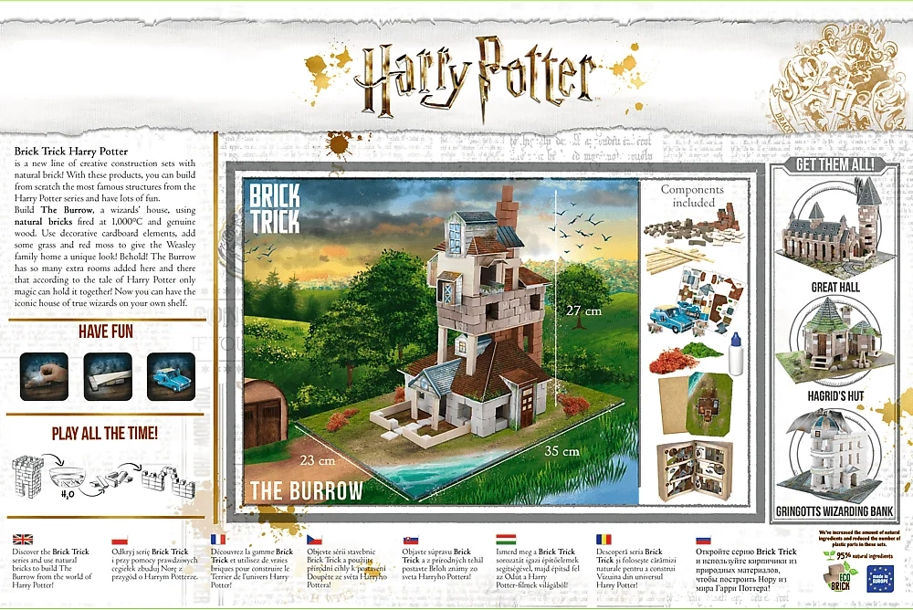 Découvrez la nouvelle gamme Brick Trick Harry Potter et construisez la maison légendaire qui, d’après les histoires, ne tient debout que par magie. La boîte combine de vraies briques, des éléments en bois et des détails en carton pour les toits et fenêtres. Le coffret inclut des plans clairs avec fondations tracées, afin que même les débutants puissent s’en sortir.