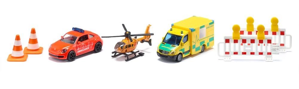 Préparez-vous pour des missions de secours palpitantes avec le coffret SIKU. L’emballage contient trois modèles métalliques détaillés – une ambulance, une voiture de secours et un hélicoptère de sauvetage – complétés par des cônes et barrières pour des scénarios réalistes. Grâce aux portes ouvrantes, au rotor pivotant et aux roues libres, les enfants profiteront de longues heures de jeu créatif.