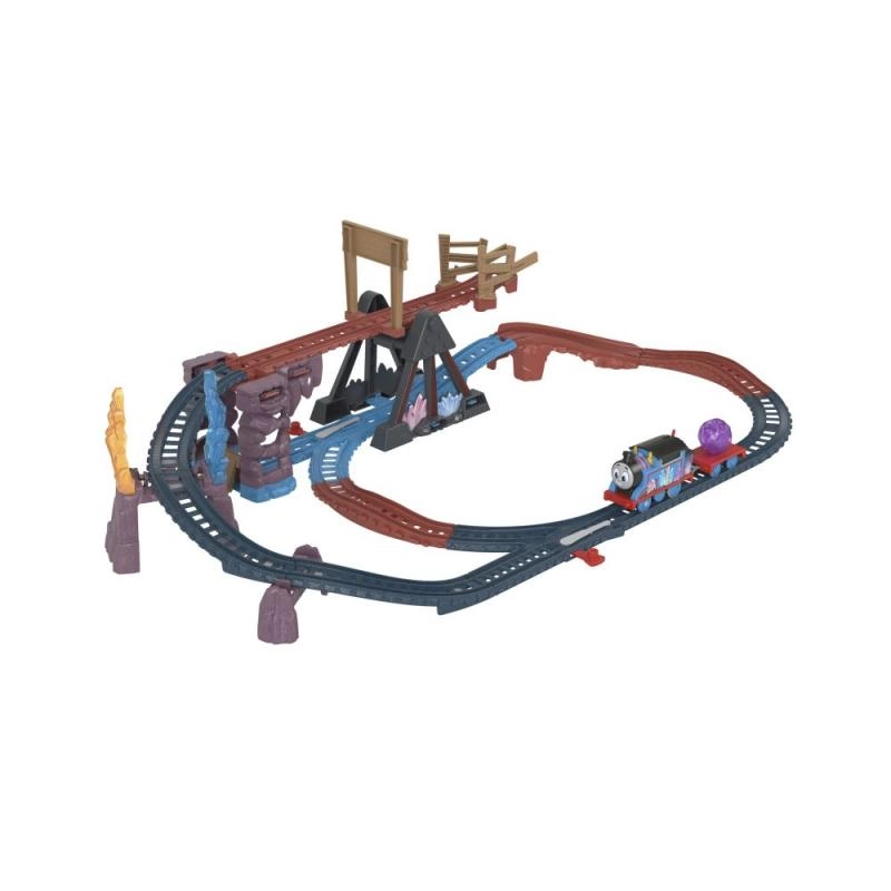 Partez avec Thomas pour une aventure cristalline ! Ce set de train d’action propose une voie multi-niveaux avec pont basculant, croisement et éléments thématiques « cristaux ». D’une simple pression sur le toit de la locomotive, Thomas démarre sur les rails et transporte la cargaison jusqu’à la grotte.