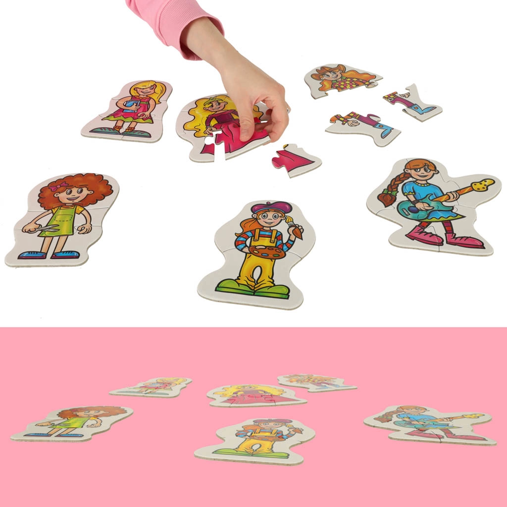 Le set contient au total 27 pièces réparties en 6 images sur le thème des filles. Grâce à l’épaisseur de 3 mm, les pièces sont faciles à tenir par les petites mains et s’emboîtent bien. Idéal comme cadeau et comme activité à partager avec les parents.
