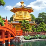 Une scène détaillée avec un pavillon doré et un pont rouge apporte l’atmosphère de la Chine traditionnelle directement chez vous.