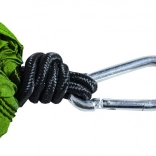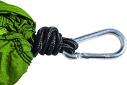 Le hamac Santiago est équipé de crochets en métal massif et de cordes tressées solides avec un fil intérieur, assurant fiabilité et une haute capacité de charge jusqu'à 150 kg.