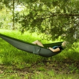 Le hamac à bascule est équipé d'un étui pratique facilitant sa portabilité - une fois plié, le hamac prend un minimum de place et tient même dans un petit sac à dos. Une fois déplié, l'étui peut être utilisé comme poche pour boissons, téléphone ou journaux.