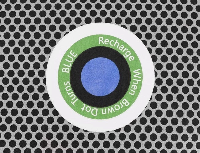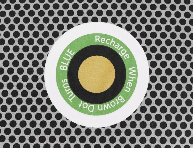 Au centre, un indicateur coloré affiche clairement l’état de saturation. La couleur orange signifie que l’absorbeur est sec et prêt à l’emploi ; lorsqu’il devient bleu, il suffit de le « recharger » en le séchant (par exemple au four à micro-ondes). L’humidité s’évapore et le produit est de nouveau prêt pour une utilisation répétée – avec une durée de vie jusqu’à 3 ans.