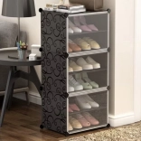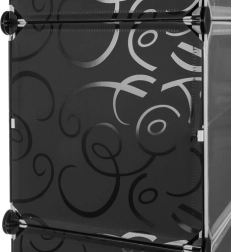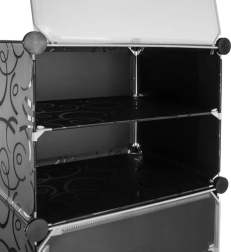 Des panneaux plastiques résistants à motif décoratif et des connecteurs métalliques garantissent une stabilité et une longue durée de vie même en usage quotidien. Le montage est intuitif, sans outillage spécifique, et grâce à ses dimensions compactes, le meuble économise de la place dans l’entrée, le dressing ou la chambre.